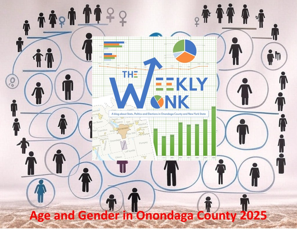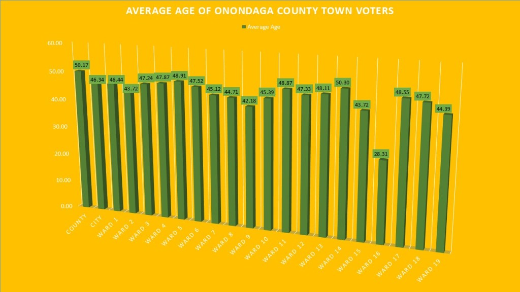 New to this year’s #weeklywonk I am incorporating age into our analysis. The average age of an active registered voter of Onondaga County is 50.17 years old. Only one ward in the City of Syracuse is older than the county as a whole, and that is Ward 14. The youngest ward is of course the 16th Ward whose average age is 28.31. This is the home of Syracuse University and that significantly brings it down. It is worth noting that younger wards like 2 (43.72), 9 (42.18) 15 (43.72) also are known to have student population in them or large apartment complexes that attract younger populations. That is why more residential wards like Ward 4 (Sedgewick 47.87), Ward 5 (Eastwood 48.91), Ward 11 (Strathmore 48.87), Ward 13 & 14 (Valley 48.11,50.30) and Ward 17 (Bradford hills, Meadowbrook, Salt Springs, Westcott 48.55) are on average older than the other wards.