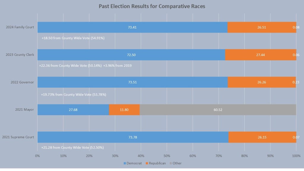 Finally, we look at the comparative races to get a sense of how the City of Syracuse when compared to the rest of the County. As you can imagine the City of Syracuse performs quite to the left of the county. In 2024 the Family Court judge race the Democrat got 73.41% of the vote, 18.50% more than the county average. The 2023 County Clerk race the Democrat got 72.50% of the vote, 22.36% more than the county average. The 2022 Governor race the Democrat got 73.51% of the vote, 19.73% more than the county average. The 2021 Supreme Court race the Democrat got 73.78% of the vote, 21.28% more than the county average. This means a Democrat can generally expect to receive 18-22% more votes than their county average in the city. This makes the performance of Ben Walsh in both of his elections all the more interesting. In his 2021 race he won 60.52% of the voter while the Democrat had 27.68% and the GOP had 11.80%. It is unlikely we will see an independent candidate this popular again this year, but the possibility remains since it has happened recently.