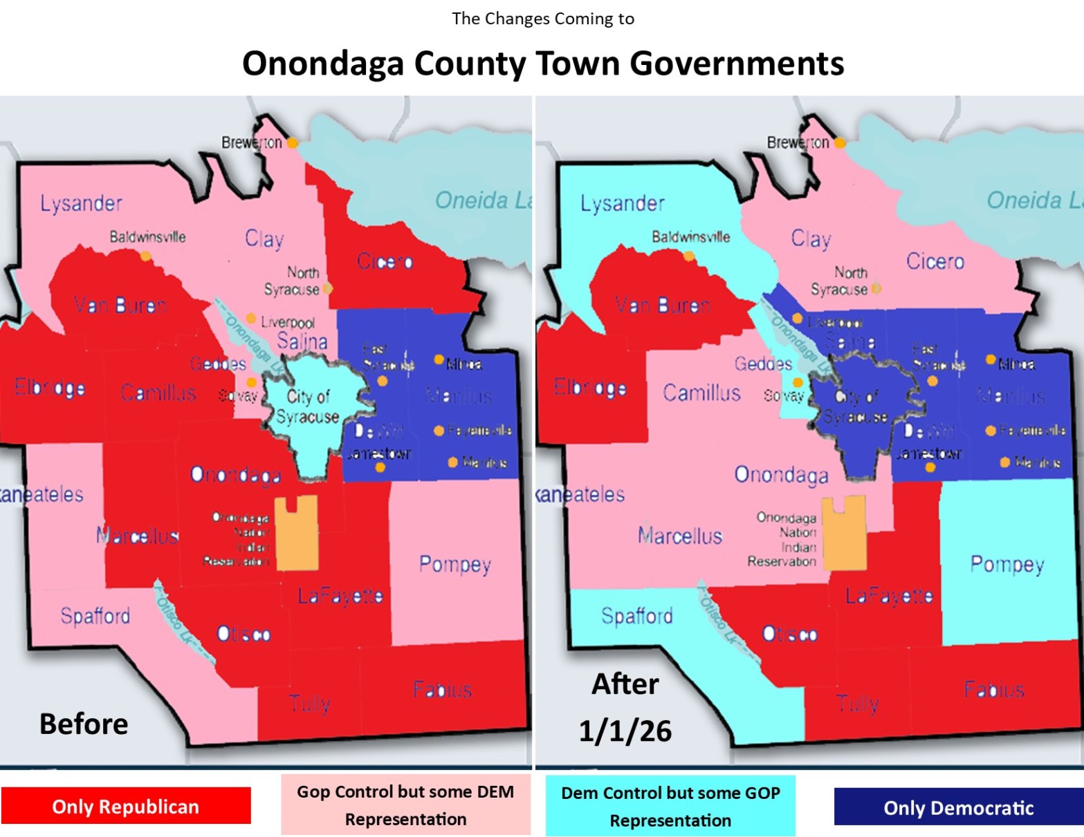 The town of Pompey has a Democratic Supervisor and Democratic board member with 2 GOP and a now open position up for election next year that could give Democrats a governing majority.