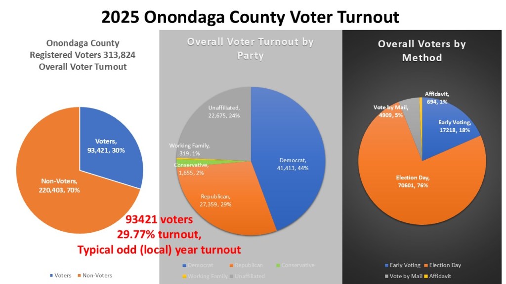 For the 2025 General Election Onondaga County had 313,824 registered voters. Of them 93,421 (30%) turnouts while 220,403 (70%) stayed home. Of those that turned out 41,413 (44%) were Democrat, 27,359 (29%) were Republican, 1,655 (2%) were Conservative, 319 (1%) were working families. Another 22,675 (24%) were Unaffiliated. Meaning either non-enrolled or enrolled in an unrecognized party. Also, of those who turned out 70,601 (76%) voted on Election Day, 17,218 (18%) voted Early In-Person, 499 Voted by Mail, and 694 voted by Affidavit (either on Election Day or during Early Voting). We will go more into voting next week. The official voter turnout percentage was 29.77%. On its surface this was a typical local (odd) year turnout like 2023 (29.64%) and 2021 (31.08%).