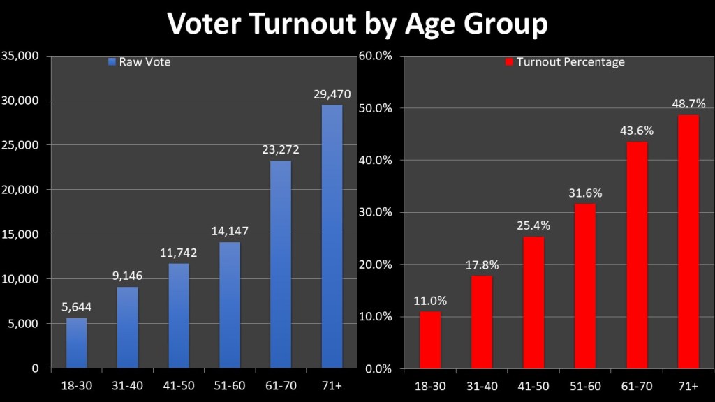 New year I wanted to look at voting age groups. To do so I broke Onondaga County into six distinct age ranges. As we can see this year, as every year, the age of the electorate is distinctively older. The older an age group, the higher in both raw numbers as well as the percentage of their registered numbers. 18-30 had 5,644 voters (11.0%), 31-40 9146 voters (17.8%), 41-50 11,742 (25.4%), 51-60 14,147 (31.6%), 61-70 23,272 (43.6%), 71+ 29,470 (48.7%). This means that 52,742 voters or 56.46% of the electorate that showed up was age 61+.