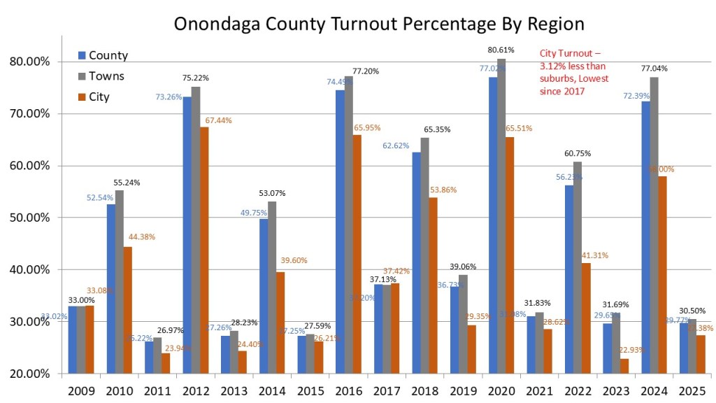 Welcome back to the #WeeklyWonk. This is my weekly look at election related stats and demographic information that is important to Syracuse, Onondaga County, and New York State. I took a brief hiatus from this blog in 2025 but now that 2025 election is officially certified, along with manual recounts and write-ins, we can now take an official look back at the stats that made up the 2025 election. As we close out December, I will do this in three parts: Election Turnout, Election Methods, & The New Blue Onondaga. This week we dive into part 1: 2025 General Election turnout.
