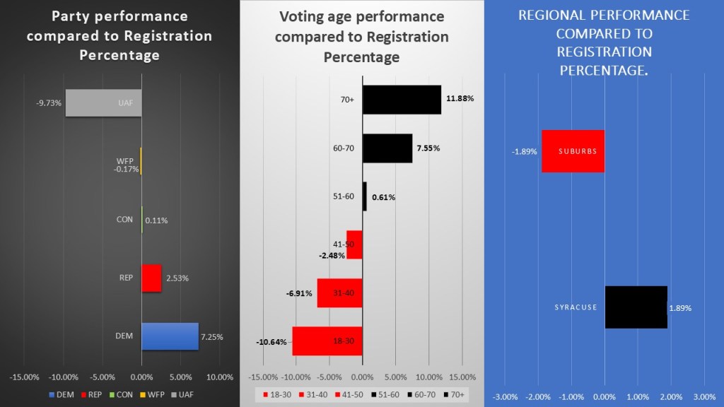 Finally, to get a true sense of these numbers we want to look at performance when compared to registration. Here we look at the percentage of turnout in the 2025 General Election when compared to a demographic registration in the overall electorate. This chart gives us a great final look at why this election turned out the way it did. We see that Democrats overperformed their registration by 7.25% which is part of why we saw the results we did last month. Unaffiliated voters severely underperformed their registration by 9.73%. Older voters 61-70 (+7.55%) and 71+ (+11.88%) truly outpaced younger voters 31-40 (-6.91%) and 18-30 (-1064%). The City of Syracuse because of its larger population overcame its turnout deficit and made up a slightly higher proportion of the electorate when compared to its registration. It is important to show these figures when politicians are making tough choices, they will remember who shows up more often than who does not. I hope switching to elections aligned with even years will help balance these numbers.