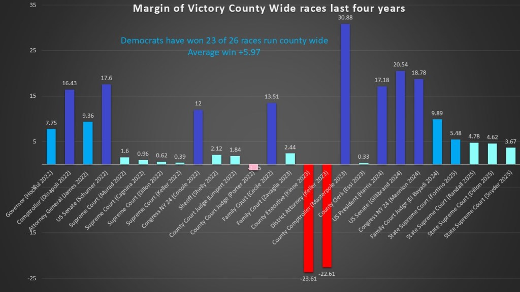 In our first slide we look at the 4-year election cycle and races that spanned the entire county of Onondaga. This data slide has been a regular feature of my #weeklywonk to combat the old notion that Democrats cannot win county wide. In face Democrats have consistently won on races that span the entire county. This includes races like Congress, NY Supreme Court, and Statewide offices that span the county and go beyond, but the county portion of those races have a definitive blue tinge. In the last 4 years there have been twenty-six races that have run in the entire county. Twenty-three of those races the Democrats have won the Onondaga County portion of those races by an average of 5.97%. The only races the GOP has won are County Court (Porter 2022), District Attorney (Keller 2023), and County Executive (Kinne 2023). However, because of poorer performances in other portions of districts that run outside of Onondaga County Democrats lost the 2022 Congressional race (Conole), all four 2022 Supreme Court races (Murad, Cagnina, Dillon, Keller) and the 2024 Presidential race (Harris). In 2025 there were only 4 NY Supreme Court races that spanned the entire county. The Democrats secured victories in every Onondaga County area, with such impressive performance that Fortino, Randal, and Dillon w to the 5th Judicial seat. Not shown on here are the 2023 Supreme Court Judicial races where Democrats elected not to put up candidates. We can see by the chart Democrats have not just done well in Onondaga County but there are getting better each year.