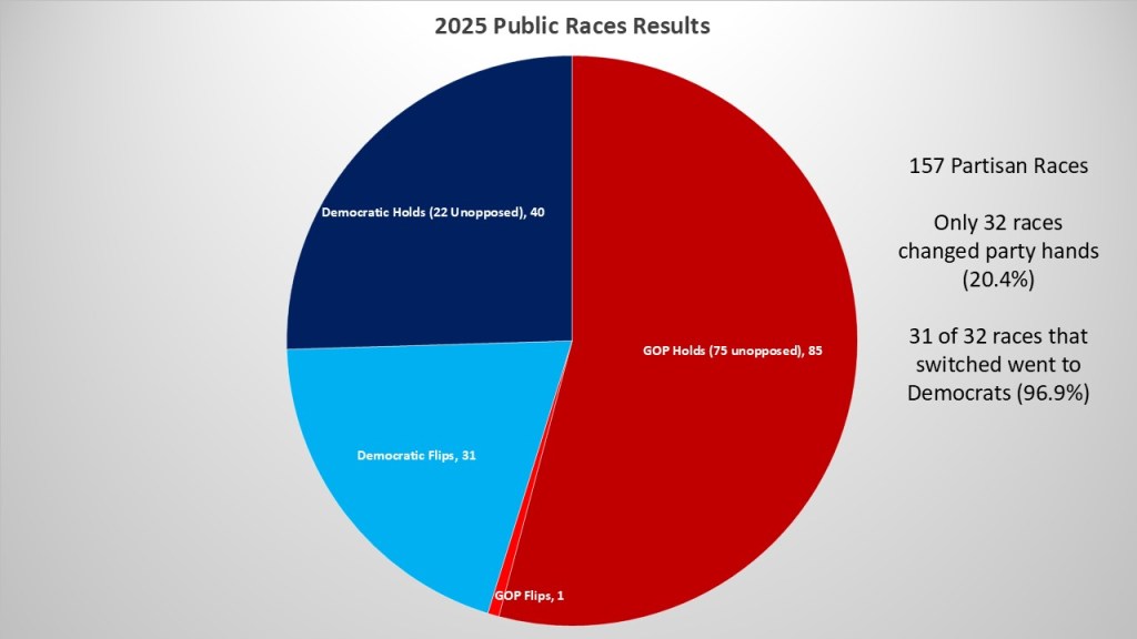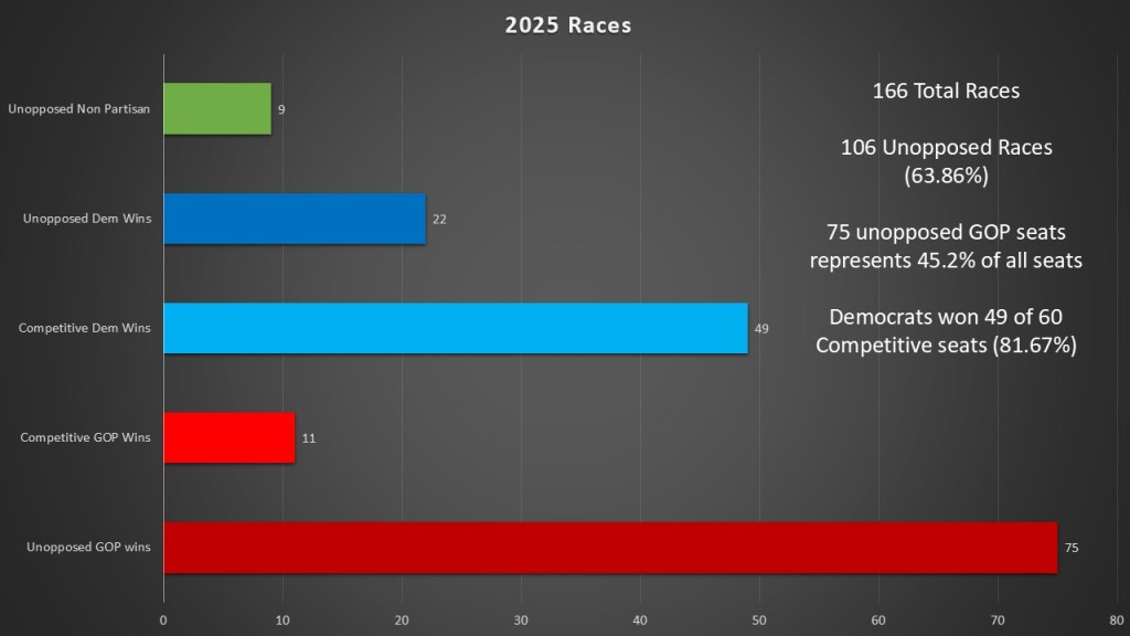Focusing on the 2025 public office races there is a hidden story to this election. The news coverage of the results rightfully focused on the gains Democrats made in Onondaga County. Yet, little attention has been given to the number of uncontested races in Onondaga County for 2025. There were 166 total races on the November ballot. 106 of those races (63.86%) were unopposed, 22 Democratic seats were unopposed by the GOP, but a staggering 75 GOP held seats were unopposed by the Democrats. Democrats did extremely will in the sixty competitive seats winning forty-nine of them for 81.67%. One must ask however how much better the Democrats position could be if they did not leave 45.2% of all seats in Onondaga County unopposed.