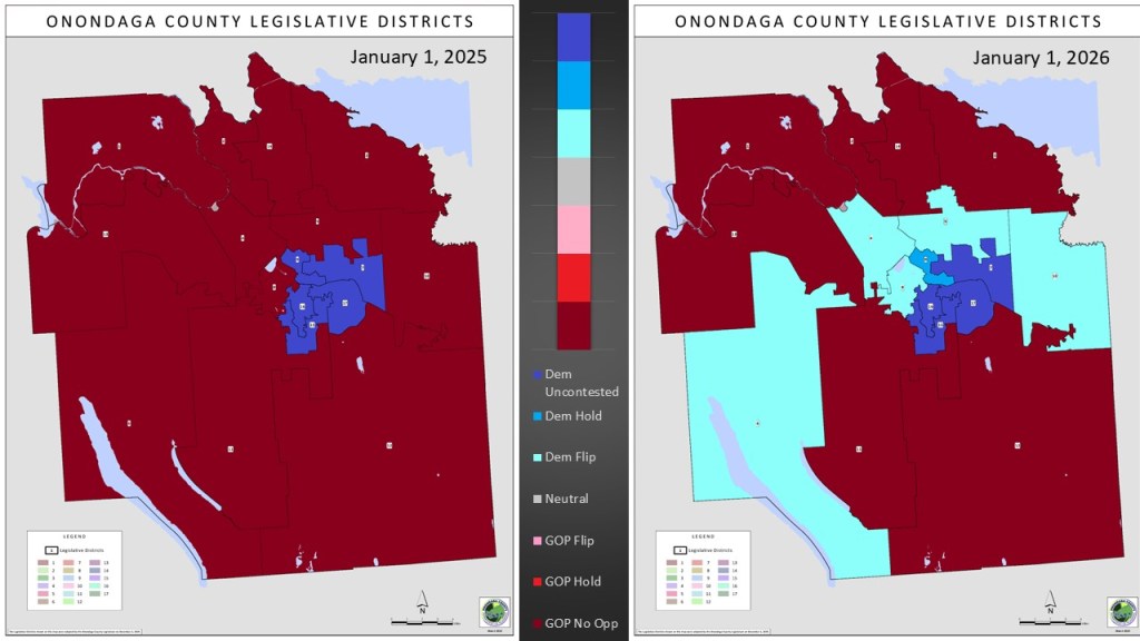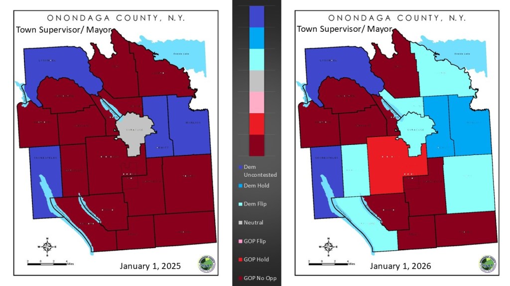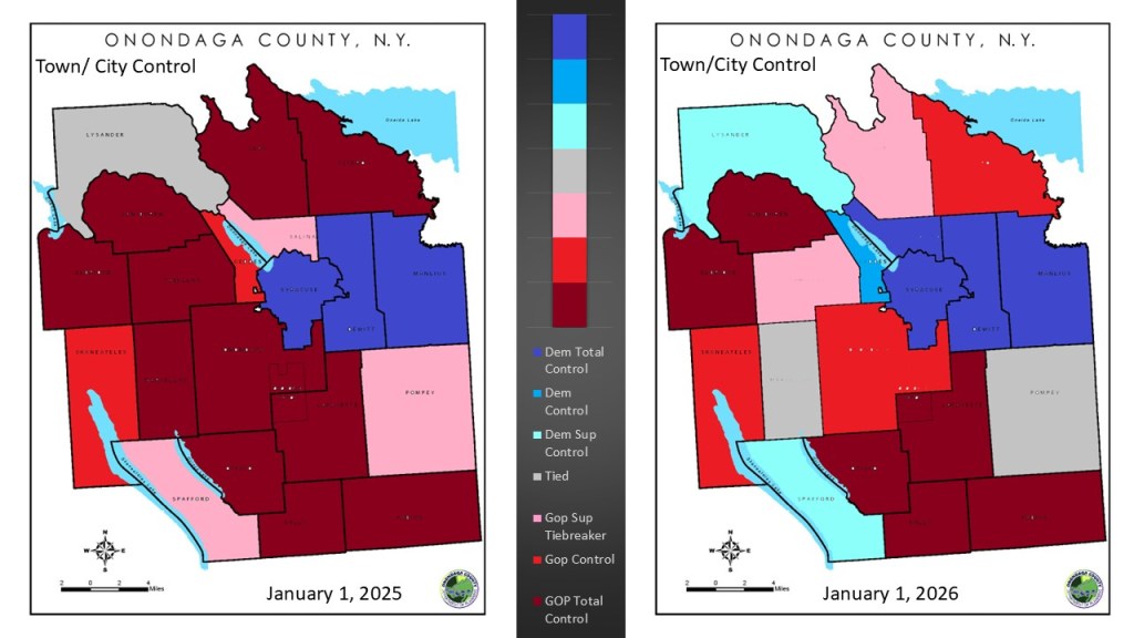 Control of a town or city is not just the chief executive; it also has to do with a council. We cannot just look at majority control either, as many issues such as bonding and charter changes will need a higher than majority vote. As 2025 started the City of Syracuse Common Council started completely Dominated by the Democratic party and ended that way in 2026. The towns work a little differently though as elected supervisors will sit on the town board to make up a voting majority. Focusing on the towns 2025 saw two town Dewitt and Manlius in total Democratic control with all elected town board members being Democratic and they remain that way in 202. Democrats took effective control of Lysander, Salina, Spafford and Geddes for 2026, breaking the log ja in Lysander that resulted from an unfilled vacancy, taking control of the Geddes town board 4-2 even without the Supervisor, winning Supervisor and a town seat in Spafford making it 3-2, and taking total control of Salina changing it from a board that was only in GOP control 3-2 because of the supervisor to a 5-0 board in 2025. Two other towns, Pompey and Marcellus will enter 2026 in a tied position as a GOP town council elect in Marcellus died before being able to take office and in Pompey the Democrat on the board will become Supervisor leaving a vacancy. Both Camillus and Clay went from all GOP control to Democrats being tied on the town board and only the supervisor making it a GOP edge. Democrats improved their holdings by one on the Skaneateles and Onondaga town boards. Democrats ran for town board positions in Cicero and Elbridge but were unsuccessful, although they did secure some representation through the Cicero supervisor race. They did not run candidates for any town boards in Fabius, Lafayette, Otisco, Tully, or Van Buren. Partisan control of the towns at the beginning of 2026 now stands 5 Democrat, 12 GOP, and two split. Four of these towns will have elections in 2026 that could swing control of the board (Clay & Camillus Supervisors, Marcellus, and Pompey Town Board TFV).