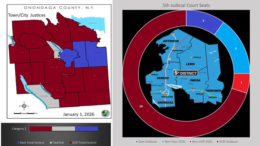 Finally, we look at the Judicial races that were on the ballot in 2025. On one hand the Town Justice races saw the least amount of movement. In fact, the town justice representation stayed the same in 2026 as opposed to the start of 2025. Democrats held onto justice positions in Geddes, Dewitt, and Manlius with all three being unopposed by the GOP, the GOP won a close race for Town Justice in Onondaga keeping it GOP hands, and had uncontested wins in Geddes, Lafayette, Lysander, Salina, Tully and Van Buren. Unmentioned towns had no judicial races this year. The 5th Judicial Supreme Court had four of its 202 members this year. Democrats won three of the four races., This brings Democrats to five sitting members of this large judicial district out of twenty. A Democrat was elected to this seat for the first time since 2020, putting Democrats in their strongest position in this district in years.
