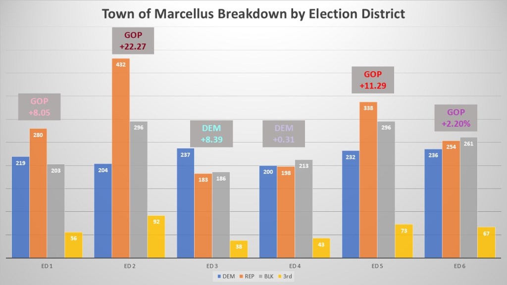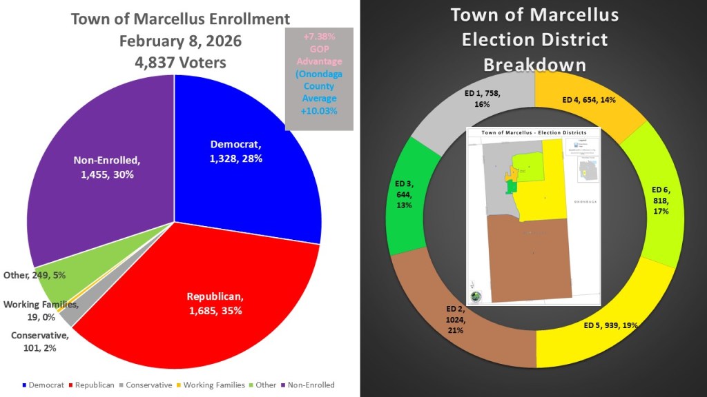 As of February 8, 2026, the Town of Marcellus has 4,837 registered voters. Republicans have the plurality with 1.685 voters (35%). Non-Enrolled comes in second with 1,455 voters (30%). Democrats come in third with just 1,328 voters (28%). The Town of Marcellus is small enough to fit inside one whole Legislative district so we will look at each of 6 Election Districts that make up the town. Marcellus village lies within the town, comprising election districts three and four, and covers approximately 27% of the town’s total area. The remaining four election districts are situated in rural areas, where voter registration is similar across each district.
