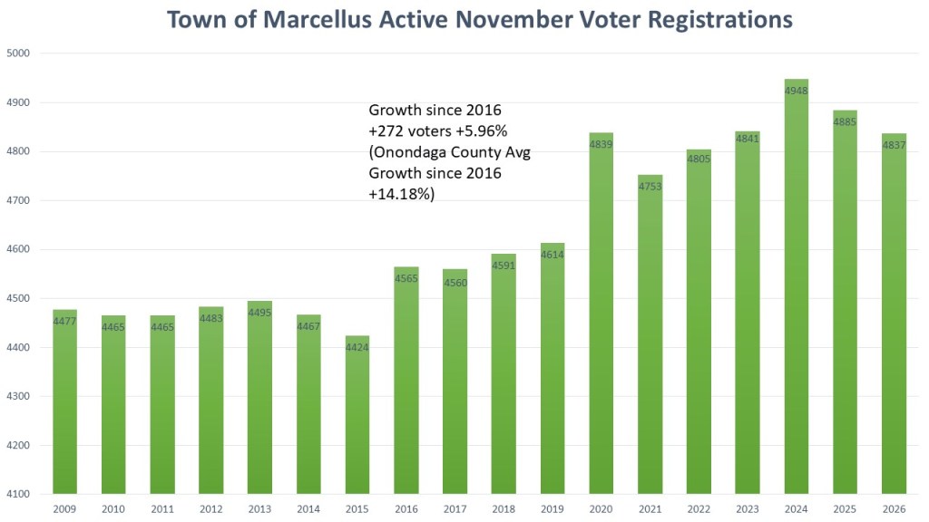 The Town of Marcellus has grown significantly since data was readily available in 20029. During this year’s # weekly, I am focusing on 2016 as a point of comparison. The town of Marcellus grew by 272 voters since November 2016. That represents a growth of just 5.96%. The bulk of that growth does come after the voter registration changes in 2019.