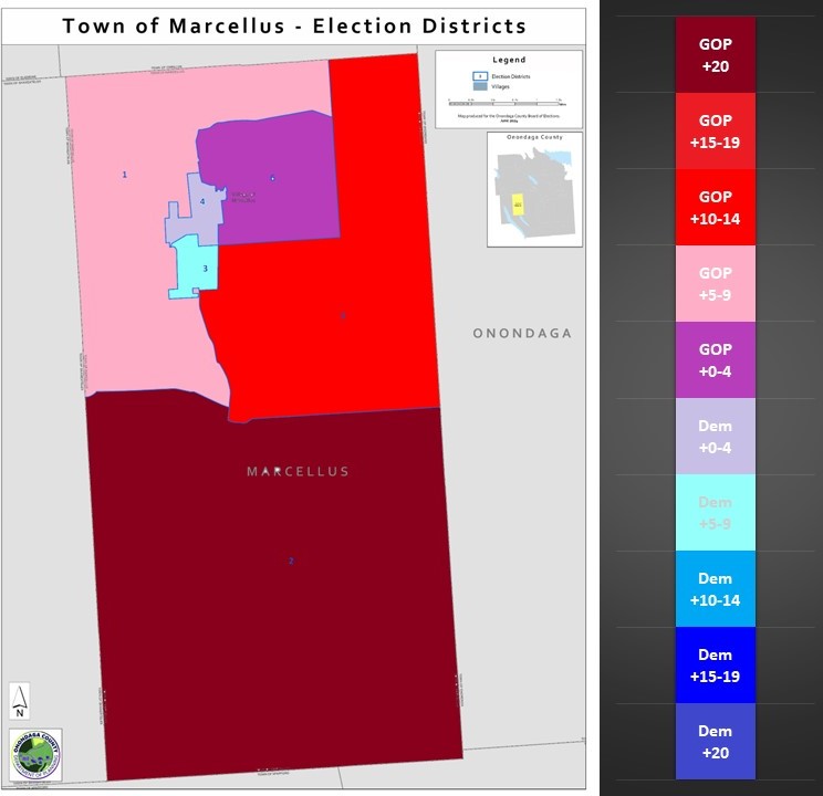 From this map we see the extreme diversity of the town of Marcellus. ED 3 and 4 serve as the representatives for the Village of Marcellus. They are the only two eds with Democrats in the plurality. ED 3 is a lean Democratic district in the +5-10% range. Ed 4 is borderline Democratic (+0-5% DEM). ED 6 just outside village and a little more suburban is borderline GOP (+0-5% GOP). ED 1 in the northwest corner is slight GOP (+5-10% GOP). ED 5 in the northeast is a strong GOP lean (+11-15% GOP). ED 6, the large southern rural ed is overwhelming GOP (>+20% GOP).