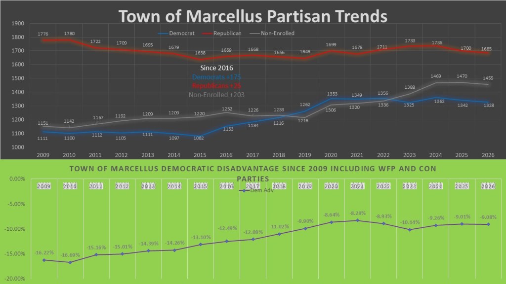 Welcome back to the #weeklywonk. This is my weekly statistical based column I host on my website, dustinczarny.com. Each week I examine an aspect of either Onondaga County or New York state. I focus on electoral or registration data to give a glimpse behind the forces that drive politics and elections. This week I am continuing my 6-part series on the towns that nominate Democratic candidates by petitions starting February 24th. In part 3 I focus on the Town of Marcellus, a normally GOP town that took a dramatic blue swing in 2025.