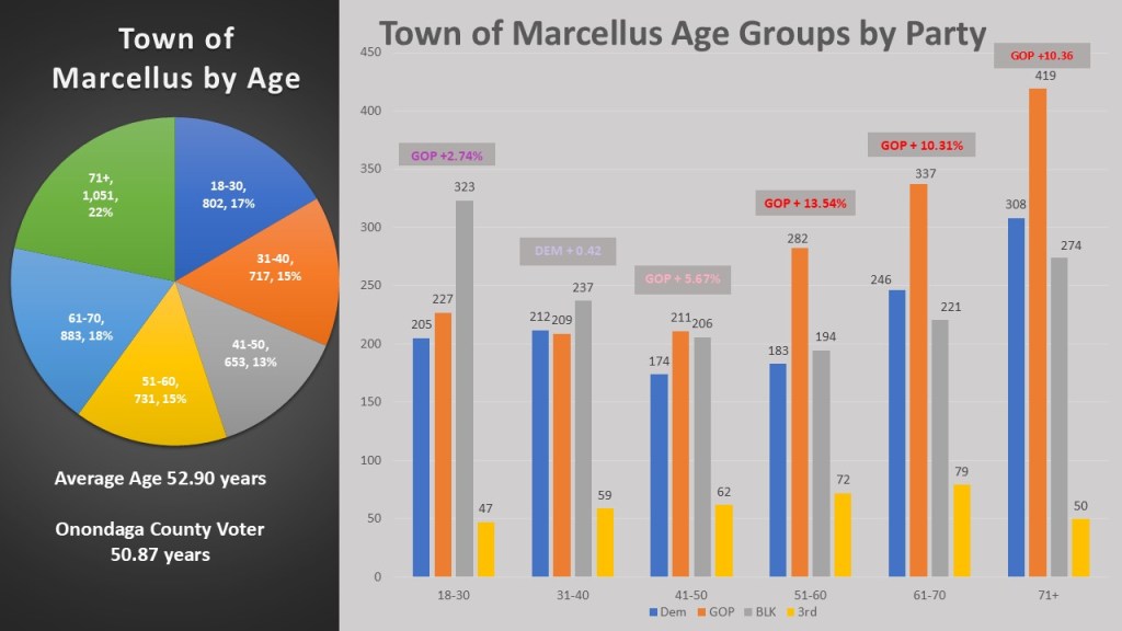 In 2026 I am rolling out an analysis for age of the average voter/ Marcellus, like most towns have an older average voter. The average Marcellus voter is 52.910 years, significantly higher than Onondaga County average of 50.87 years. The 71+ age group makes up the largest proportion, accounting for 22% of the total. When we look at the age group’s partisan leans, we see that the GOP leads in five of the six age groups with Democrats only outnumbering GOP in the 31-40 group. However, we also see the non-enrolled beating both parties with the two groups under forty and beating the Democrats in the two groups 41-60. The GOP tends to dominate the over fifty range while just barely are ahead in the under fifty range.