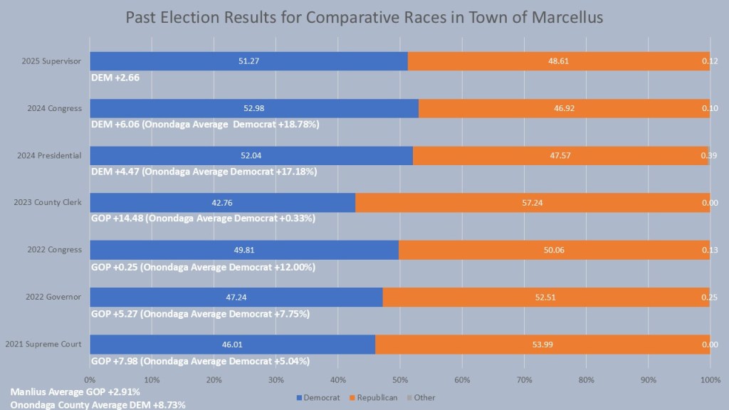 When we look at the Comparison races, we see that despite the GOP numerical advantages, Marcellus Democrats have had their share of success in this town. In Presidential years Democrats can expect about a 5%-point victory with John Mannion (+6.06%)), Kamala Harris (+4.47%) both winning the town in 2024. In Gubernatorial years, the GOP tended to have the edge with Brandon Williams (0.25%) barely winning the congressional race and Lee Zeldin (+5.27%) winning the Governor race in this town. In local years Democrats tend to not do as well with the GOP Lisa Dell winning the County Clerk race by +14.4% and Daniel Fogel winning her 2021 Supreme Court race in Marcellus by last year by 7.98%. However, in 2025 the Democrat Jane Carmody won the Marcellus Supervisor race by 2.65%. This continued the shift towards Democrats we saw in 2024. On average in the comparison race Marcellus has a +2.91% GOP lean when compared to +8.73% Democrat in Onondaga County as a whole.