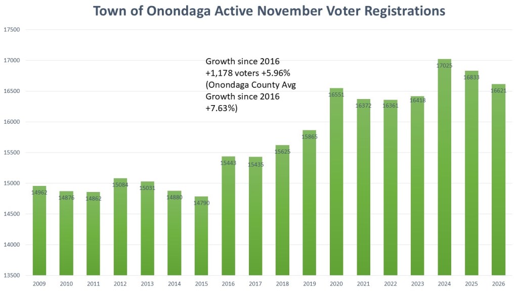 The growth of Onondaga has mirrored the growth of Onondaga as a whole. The growth of voters started in 2016 but dramatically increased in 2020 after the registration changes by the New York State Legislature took effect. The high-water mark was the 2024 election, and we are seeing the normal retreat that happens in the following months of a Presidential election. 2016 is the standard area of reference for us when it comes to growth and we can see that the Town of Onondaga grew by 1,178 voters during that time (+5.96%). This is like the growth rate in Onondaga County of +7.63% since 2016.