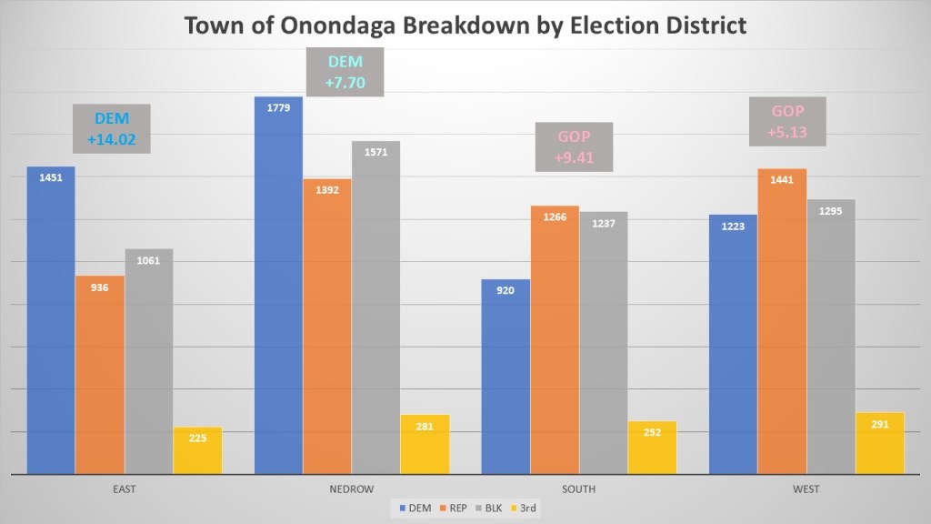 How even is the town of Onondaga Registration? Democrats have the plurality with 5,373 voters (32%). Non-Enrolled are in second place with 5,164 (31%). The Republicans are in third place with 5,035 voters (30%). Other (716 voters, 4%) Conservatives (270, 2%, and Working Families (63, 1%) make up the rest of the 16,621 voters. Democrats only have a +2.03% borderline registration advantage which makes Onondaga one of the closest towns in our County. Despite its size it is in mostly one county legislative district, OCL 11, except for the Onondaga Nation which is in OCL 12. There are no separate villages in the town. Onondaga elects all town officials in town-wide elections. Thus, to look at the town in a regional sense I have broken it by ED into four distinct sections. The western section (4,250 voters 26%) that borders Camillus and Geddes. South Onondaga (3,675 22%) is the more agrarian portion of the town. The East portion (3,673, 22%) which is densely packed suburban style bordering the valley of Syracuse. Finally, the Nedrow section (5,023, 30% wrapping around the south valley of Syracuse including the Onondaga Nation territory). These are not perfect regional breaks but will allow us to look at this large Town in segments.