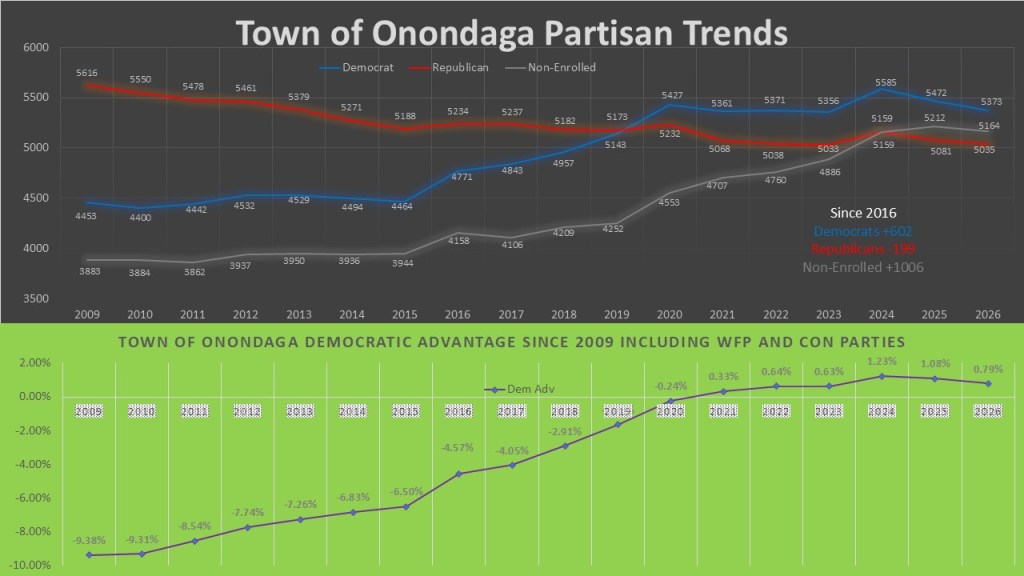 These two graphs show the partisan advantage since 2009. Again, the town of Onondaga is a microcosm for the how the suburbs of Onondaga County have transformed over the last 10 years. Democrats overtook the GOP in this town in 2020 and non-enrolled overtook the GOP in 2025. Democrats since 2016 have added fifty-one voters. The GOP since 2016 has lost 199 voters. The non-enrolled were again the highest gainers, adding one thousand voters since 2016. Even when you add in the working families and conservative to determine the ideological advantage the pattern is clear. In 2009 the Town of Onondaga was a solid 9.38% advantage for the GOP and now is a as close as possible with a .79% advantage for the Democrats.