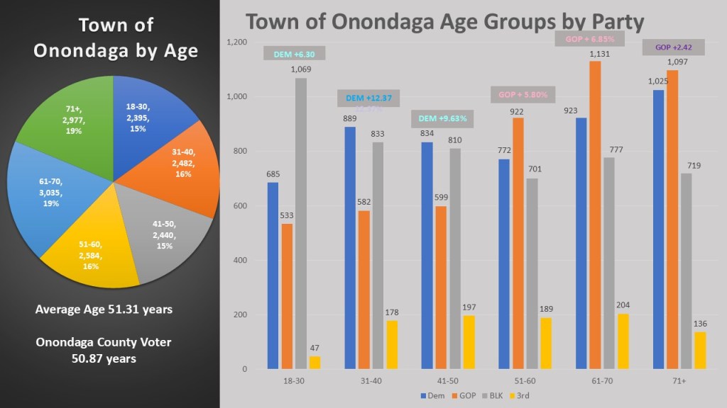 This year I am looking at age to examine these political subdivisions, The Town of Onondaga is a normal town averaging 51.31 years, just slightly over the Onondaga average of 50.87 years. The largest age group is 61-70 years old, but all the age groups are close in size. When looking at the partisan breakdown of the age group the theme of a divided town of Onondaga continues. Democrats are solidly dominating the under fifty age groups. 31-40 Democrats have a +12.37%, 41-50 Democrats have a +9.63% advantage, and the youngest group Democrats only have a +6.30% because of the domination of the non-enrolled in that age group. Republicans have slight edges in the more populous older age groups. 51-60 the GOP has +5.80%, the 61-70 GOP has +6.85%, and the oldest group the GOP has a borderline advantage of 2.42%.