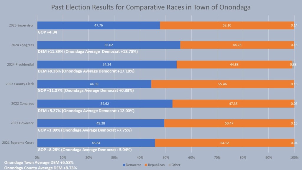 When we look at the comparative races, we see a Town that truly acts differently in higher turnout presidential years, mid turnout gubernatorial years, and low turnout odd years. In 2024 the Town of Onondaga showed up for Democrats in a huge way, giving a +11.39% for John Mannion for Congress and a +9.36% for Kamala Harris for President. In the Gubernatorial year we saw a split. Onondaga supported Francis Conole by 5.27% for Congress but Lee Zeldin edged out a +1.09% advantage (though under a majority). In Odd years Democrats have not fared so well. Emily Essi for county clerk won countywide by .33% but lost the Town of Onondaga by 11.07% in 2023. Likewise, Anthony Brindisi of Supreme Court won the county by 5.04% but lost the Town of Onondaga by 8.28%. In 2025 Khalid Bey improved on both of those results but still lost the Town Supervisor race by 4.34%. Again, the Town of Onondaga is close to the County of Onondaga average of the six comparative races where Democrats win the town on average by 5.58% and Onondaga County on Average by 8.73%.