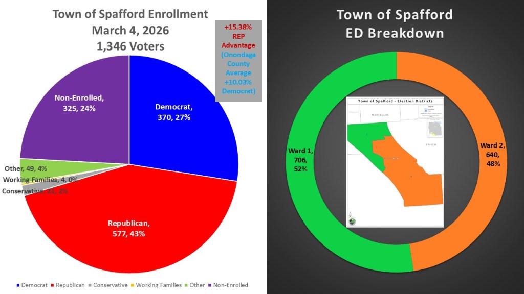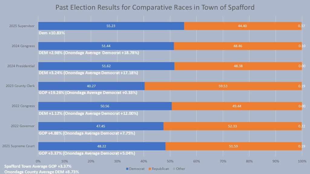 The most surprising facet of Spafford is its ability to elect Democrats despite the seeming registration dominance of the Republican party. In the past 15 years, the town of Spafford elected Democrats, sometimes gaining control of both the town board and Supervisor positions. In 2025 the pendulum again swung back to the Democrats winning the Supervisor race by 10.83% and gaining control of the board. When we look at the six comparative races, we see that Spafford lives up to the very epitome of a battleground town. Democrats won the 2024 Presidential and Congressional race as well as the 2022 congressional race. Republicans won the 22021 Supreme Court and 2023 County Clerk along 2022 Governor’s race. All were within five points except the 2023 County Clerk. The GOP averages a 3.37% margin of victory wh9ich is about a ten-point swing form the county average of Democrats +8.73%.
