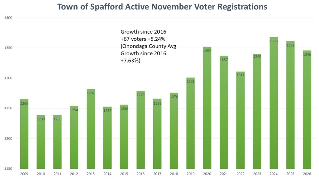 Not only is Spafford one of the smallest towns, but it is also growing at a rate slower than the rest of Onondaga County. Like most areas of Onondaga County and indeed New York state. The growth came about after 2019 with easier voter registration laws thanks to the Democratic takeover of New York State government. Looking back ten years, the Town of Spafford added sixty-seven voters, a growth of 5.24%. This is slightly bellowing the growth rate for Onondaga County as a whole (+7.63%) during the same period.