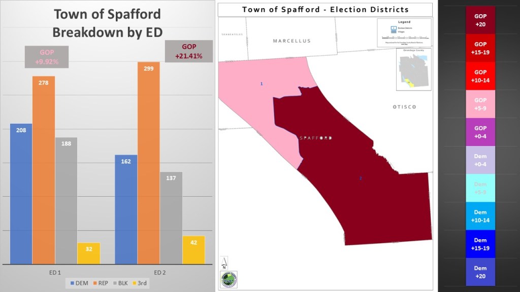 The Town of Spafford’s small stature makes it hard to delve deep into its different areas. However, even though there are only two election districts, we do see diversity. The. northern more populous election district is only a lean Republican district. The GOP has a +9.92% enrollment advantage here. The southern less populous district is one of the more GOP dominant eds in the county. The Republicans have a +21.41% enrollment advantage here. Despite the GOP dominance, in neither election district do the Democrats drop below second place. That is an important distinction in this rural town.