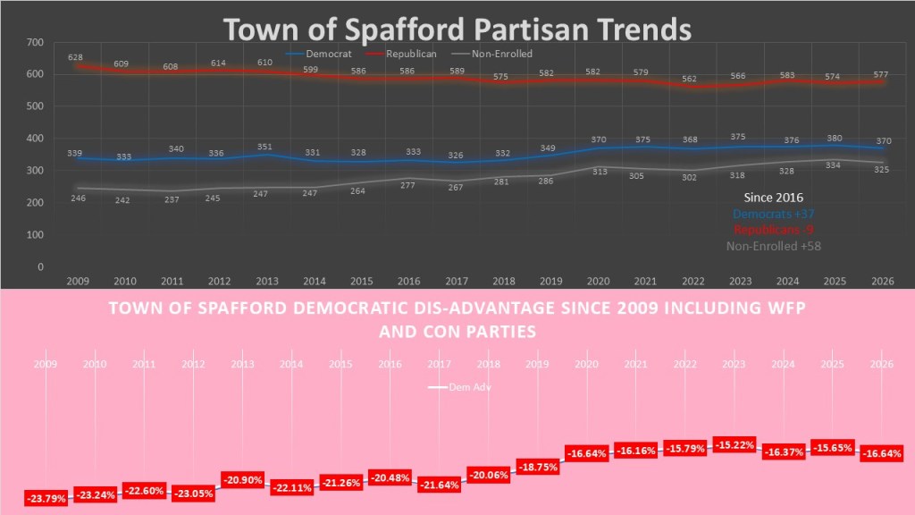 Spafford is a pretty static town. Despite this Democrats are making gains in this town. Since 2016 the Democrats have gained thirty-seven voters. The republicans have lost nine voters during that time. The non-enrolled have gained fifty-eight voters. In small towns the Conservative population can have a larger effect in tilting the town to the right. Even here Democrats and the left are making gains. In 2009 The combined GOP and Conservative dominance of Spafford gave a Democratic disadvantage of -23.79%. It has shrunk to -16.64% this year. Another sign that Spafford is not as republican as you might suspect.