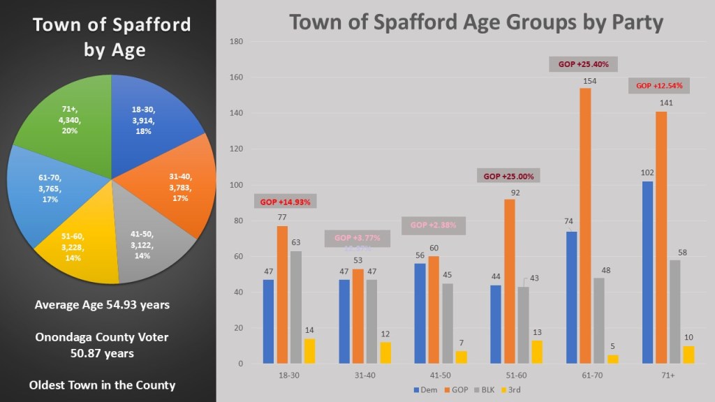 Spafford has another distinction besides being the most competitive town. It is also the oldest. The average voter in Spafford is 54.93 years old. That is much older than the Onondaga County average of 50.87 years old. In fact, it is the oldest town in Onondaga county and as you might expect the 91+ age group is the largest. We do find diversity in the partisan makeup of the age groups. Like always the Democrats do better under fifty age groups and the GOP does better in the older groups. Still every group the GOP leads, even in the 18-30 group. And we do not see the dominance of the non-enrolled in the youngest groups like we have with other towns.