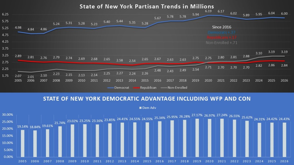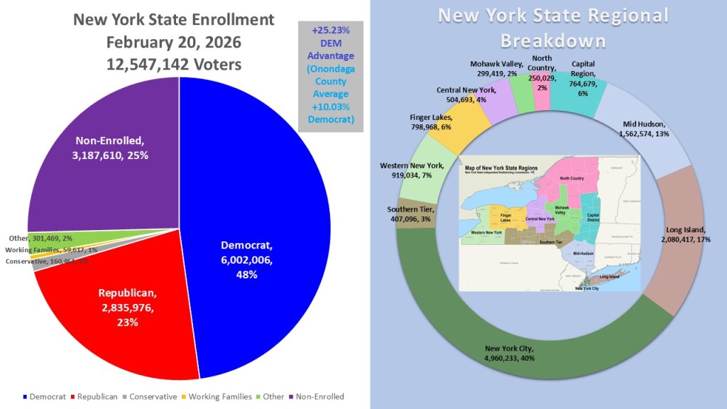 On February 20, 2026, the NYS Board of Elections pulled registration data from every County board of Elections. This gives us a good opportunity to look at how New York Stands currently with up-to-date data. As of February 20, 2026, New York has 12,547,142 active voters. Democrats are the dominant plurality of 6,002,006 voters (48%). Non-enrolled are second in New York with 3,187,610 voters (25%). Republicans have fallen to third in New York with just 2,835,976 (23%). Rounding out the population are the other category (301,469 2%), Conservative (160,464 1%), And Working Families (59,617 1%). This gives Democrats a +25.23% Democratic enrollment advantage statewide. One of the most controversial topics in New York is breaking it up into regions. To avoid this, I am using the regions as designated by the New York “Independent” redistricting commission. It is evident that New York City accounts for 40% of the state’s active voters, highlighting its dominant influence within New York. Long Island (17%) and the Mid-Hudson Valley (13%) follow this. The rest of the regions across upstate New York range from 2-7% each.