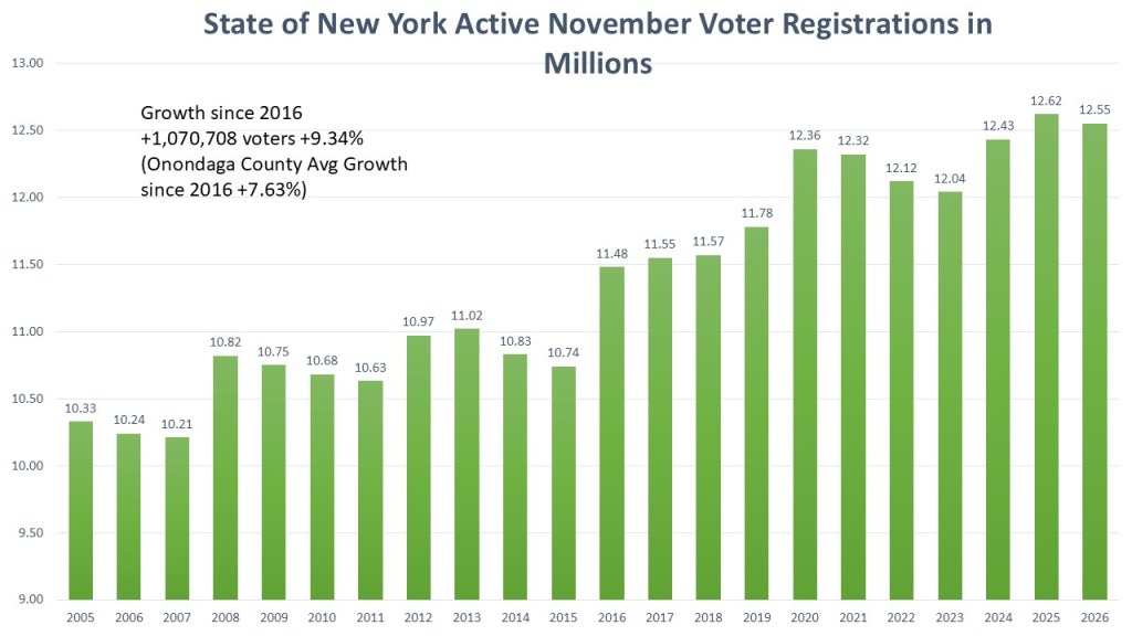 This chart shows the number of active registered voters in the State of New York in the millions. Currently New York has the second highest total of active registered voters going back to 2005. The season I cut this off in 2005 is the tracking of active and inactive voters started at that point so data before that date is not really comparing apples to apples. The changes in registration options clearly show the growth in registered voters in New York. Online voter registration began at the NYS DMV in 2016. After Democrats gained control of the NYS legislature in 2019, they passed measures like statewide transfers and a constitutional 10-day registration deadline, making it easier for voters to register and update their status. This year New York is finally launching Automatic Voter Registration with the DMV that will increase voter registration further. Since 2016 New York has added 1,070,708 voters which is a growth rate of 9.34%. Onondaga County trails the state average during that period with a growth rate of only +7.63% during this time.