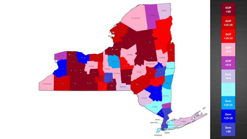 People often fail to recognize the rich diversity found throughout New York State. Here is the heat map of New York counties in terms of partisan advantage. Obviously, we see a great deal of blue in NYC and the counties downstate. But even in the upstate regions we see a great deal of counties with large clue leanings, in counties hosting large upstate cities like Buffalo (Erie), Rochester (Monroe), Syracuse (Onondaga), & Albany (Albany). Schenectady, Rensselaer, and Columbia counties make up the capital region. Tompkins County is distinctive due to Ithaca’s influence on its development. No matter what region of New York we look at there is at least one county in the region that at least is borderline Democrat with the lone exception of the Mohawk Valley.