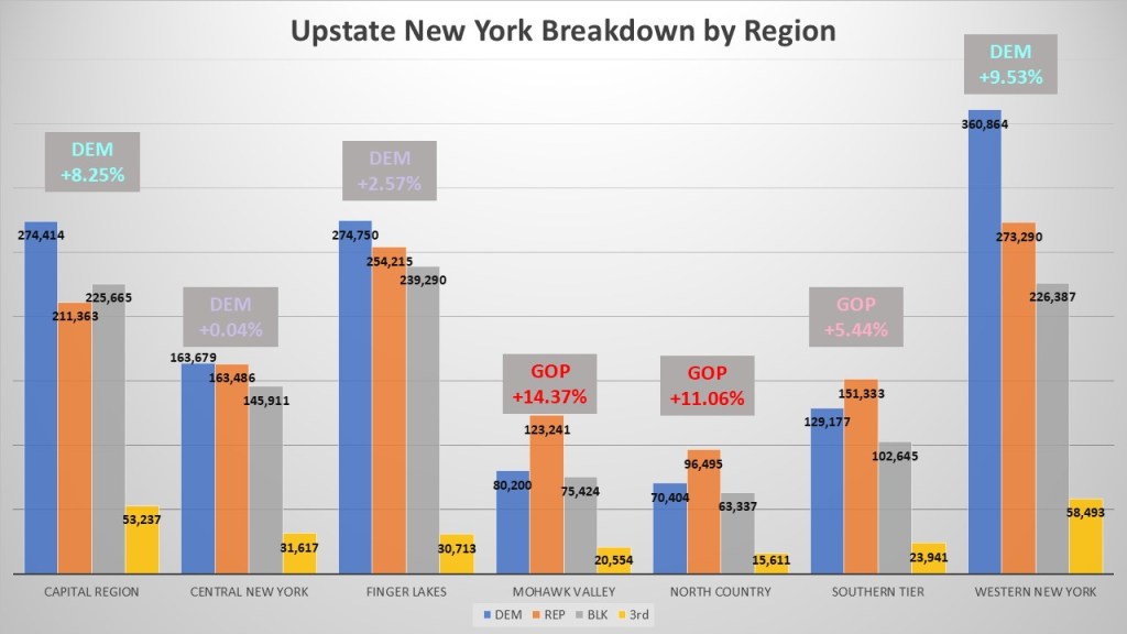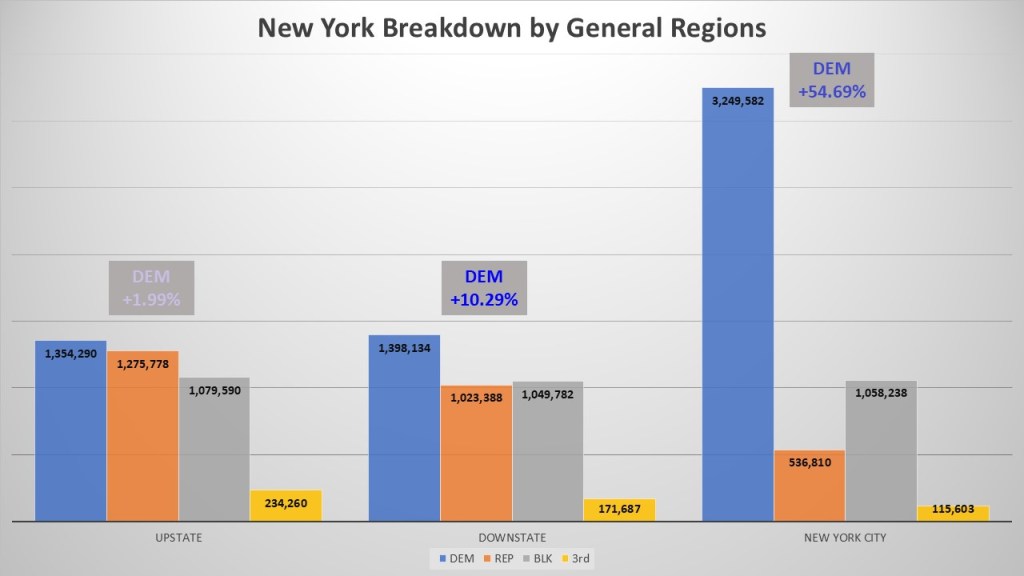 When people talk about New York State, they break it into three different macro regions: New York City, Downstate, and Upstate. For terms of this discussion, I will wade into the discussion of where upstate New York starts. Upstate New York starts Above the mid-Hudson line. I combined all regions north of mid-Hudson into the upstate region (Capital Region, Central New York, Finger Lakes, Mohawk Valley, North Country, & Western New York). Downstate are the regions directly bordering NYC (Mid-Hudson & Long Island). Democrats do well in downstate with a solid +10.29% advantage and non-enrolled are starting to overtake the GOP. Of course, in NYC the Democrats are dominant with a +54.69%. There are more Democrats alone in NYC as registered voters in the other two macro-regions individually.