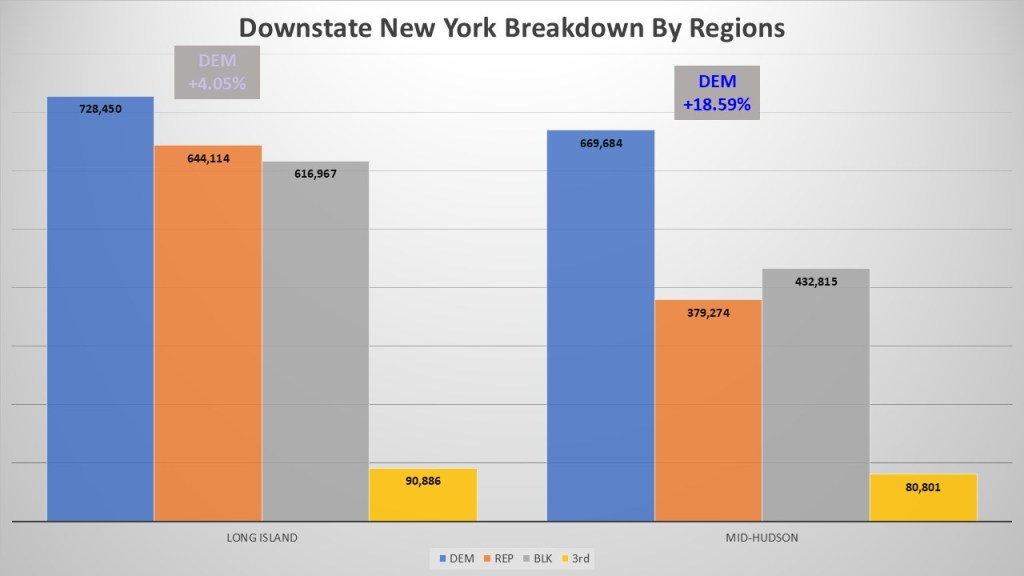 When we investigate the two regions in the downstate macro-region (mid-Hudson and Long Island) we do see a definite diversity. Long Island, which consists of Nassau and Suffolk Counties, is just barely Democratic with a margin of +4.05%. This political leaning is evident in the composition of their county governments, as well as their congressional and state representatives. Counties in the Mid-Hudson Valley, located outside New York City, show strong backing for the Democratic Party. Westchester, Ulster, and Rockland counties contribute to a notable regional shift toward the Democratic Party, reflected in a strong advantage of +18.59%. In Mid-Hudson we see the telltale sign of non-enrolled significantly outnumbering the GOP.