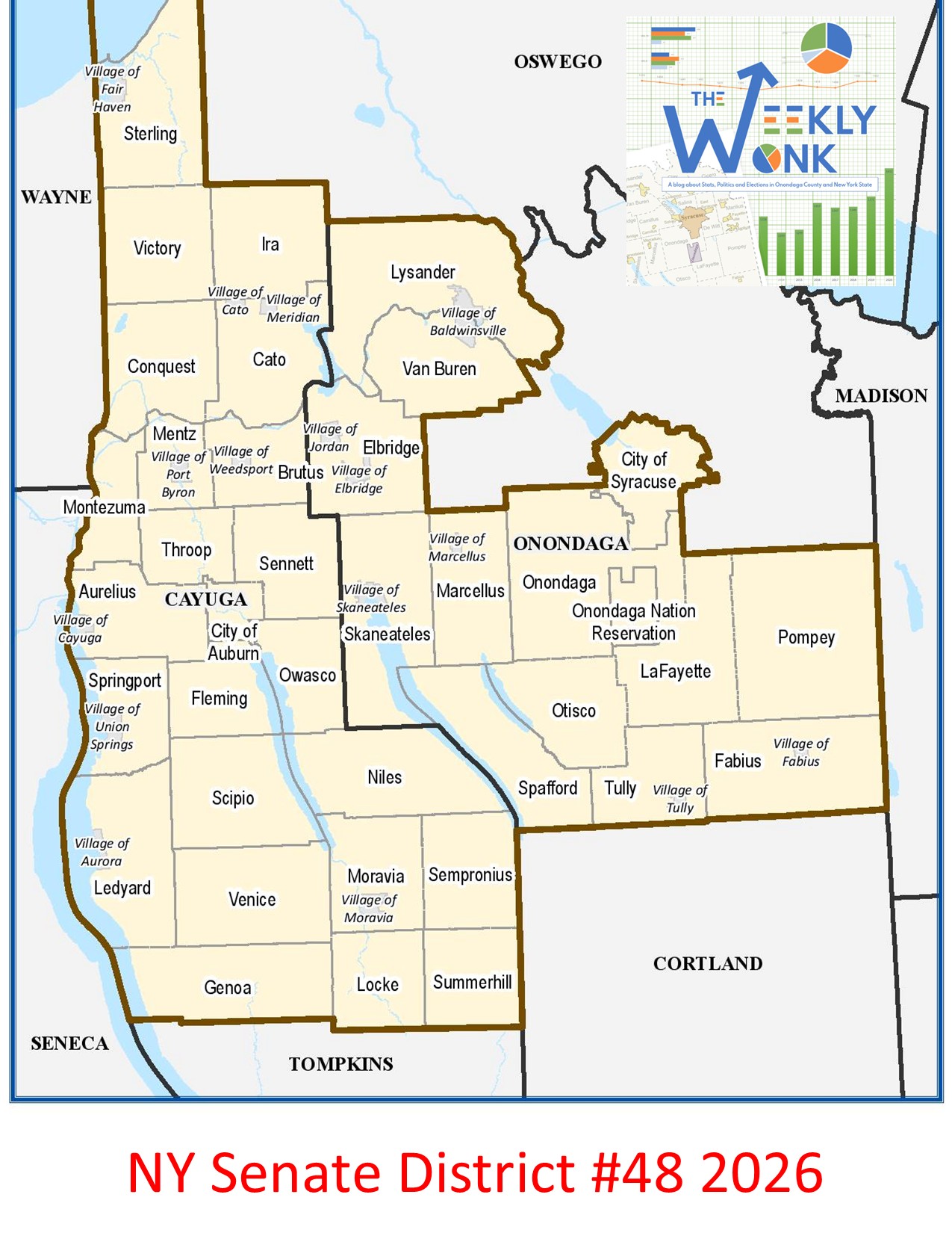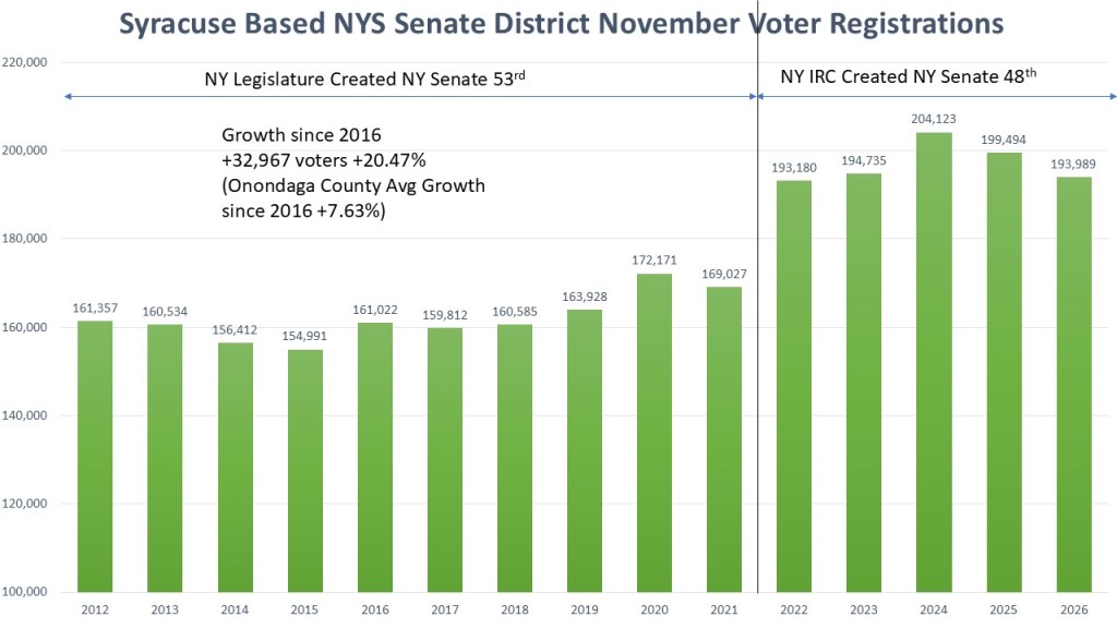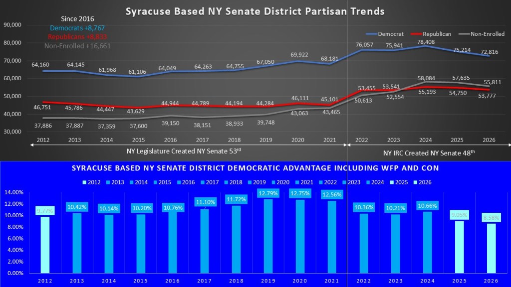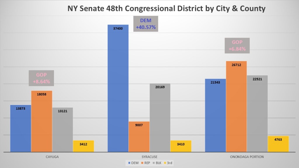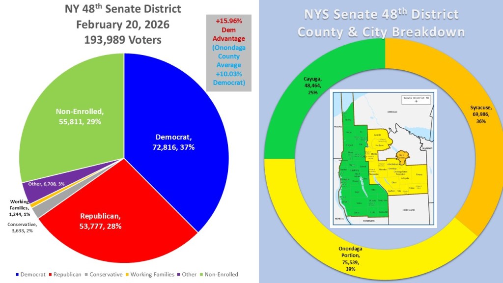 The current makeup of NY 48th has 193,989 active registered voters as of February 20, 2026. 72,816 (37%) are Democrat and represent the plurality. In a telltale sign of a Democratic dominated district the non-enrolled are in second place with 55,811 (29%) voters. The Republicans are in third place with 53,777 (28%) voters. Rounding out the district are Other (6,708 3%), Conservative (3,633 2%) and Working families (1,244 1%). The district consists of three distinct sections. The City of Syracuse has 36% (69,986 voters) of the district. The south and west portions of Onondaga County make up the largest portion at 39% (75,539 voters). The entirety of Cayuga County is in the district and makes up just 25% (48,464 voters) of the district.