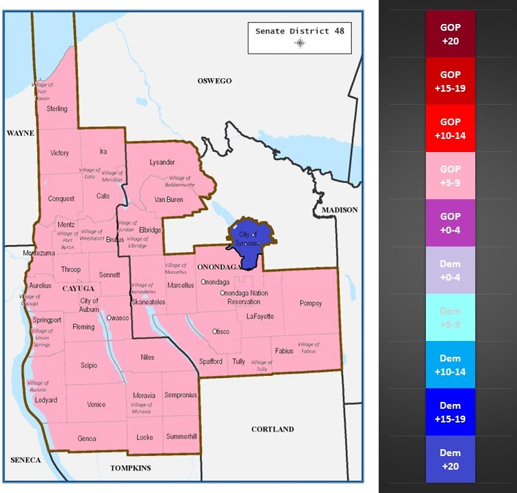 The three portions of the 48th district show one of the major dynamics of the district. We see the highly dense City of Syracuse with an overwhelming Democratic lean of over +20%. The rest of the district does lean GOP, but not overwhelmingly so. The remaining Onondaga County portion is in the GOP +5-9% category. The same with Cayuga County which is also in the GOP +5-9% category. While there are towns better than others and the City of Auburn slightly tilts blue on its own, the story of this district is clear. Can the City of Syracuse continue to exert dominance over the rest of the district?