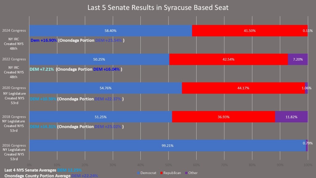 Finally, without the ability to get comparison races that span the entire district because of the radical redistricting in 2021 we are going to look at the last five elections. In 2016 Dave Valesky because of his connections to the IDC and NY GOP caucus had his third straight non-contested election. In 2018 Rachel May beat Dave Valesky in the primary but Valesky remained on the ballot because NY laws about third parties not allowing him to drop off. She easily won election by 14.31%. In 2020 Rachel May won re-election by 10.59%. The closest election was the year after redistricting. One of the worst years for Democrats and a brand-new district had Rachel May only win by 7.21%. Although she was already likely to win a tight race, a third-party conservative candidate also helped her secure victory. In 2024 though Rachel May bounced back with her biggest win at +16.90% after the newer part of her district got to know her during the last ter. It is the Onondaga County portion of the district that consistently votes for May. Rachel May has won her last four elections by +12.25%, but won the Onondaga County portion of the district, including Syracuse by an average of +22.24%.