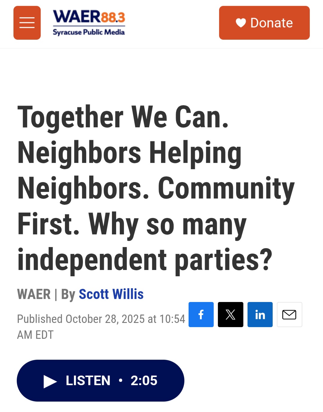 It must be said that these are not independent candidates for the most part,” he said. “Most of these candidates appear on a major party line. And because of our unique system of fusion voting in New York, it allows their name to appear multiple times.” https://www.waer.org/news/2025-10-28/together-we-can-neighbors-helping-neighbors-community-first-why-so-many-independent-parties Subscribe to dustinczarny.com for all content and electionContinue reading “Together We Can. Neighbors Helping Neighbors. Community First. Why so many independent parties? – WAER”