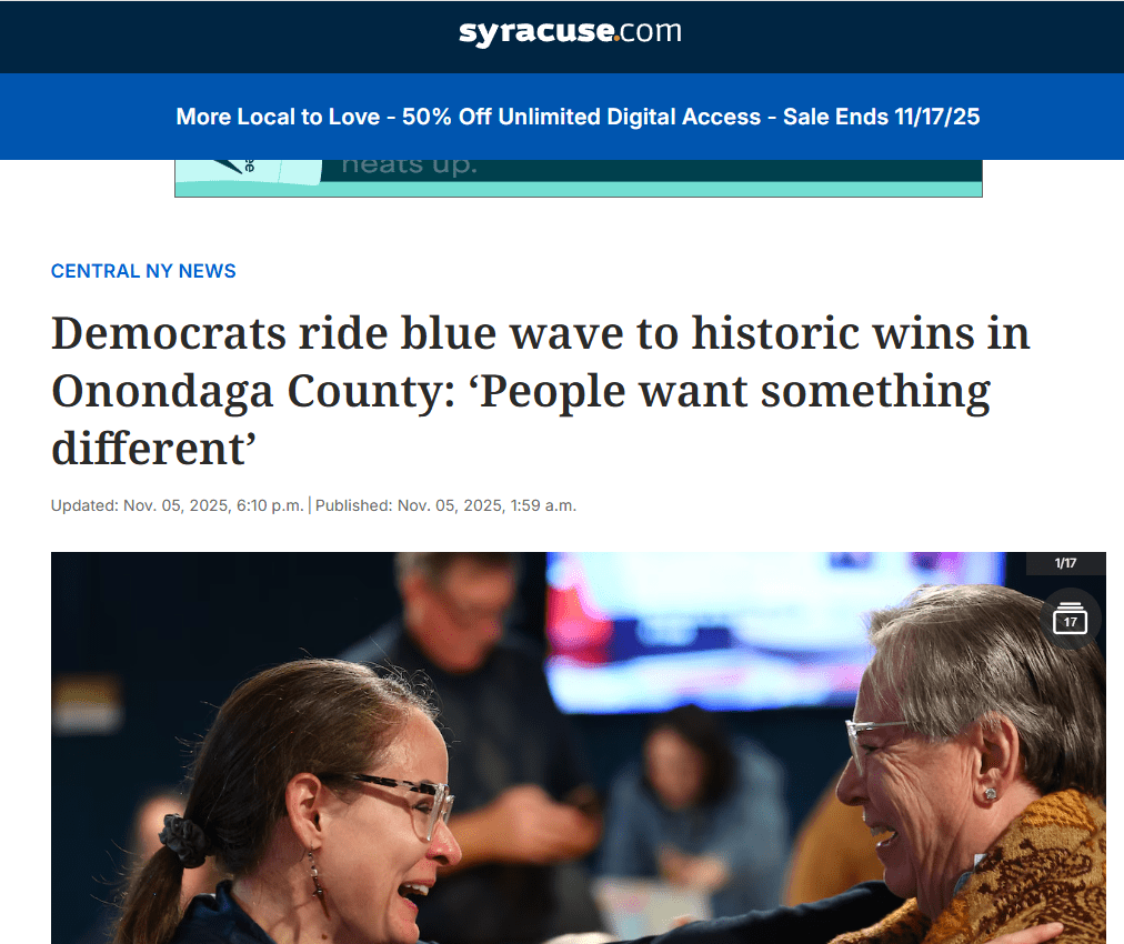 On the other side of a bipartisan office sits Dustin Czarny, the Democratic elections commissioner in Onondaga County. He highlighted the turnout of about 40,000 Democrats and the support from unaffiliated voters. He emphasized the successful targeting of key districts, “4, 5, and 10 were all targets for us, and almost every year for theContinue reading “‘They didn’t just win, they crushed it,’ Democrats flip the Onondaga County Legislature – CNY Central”