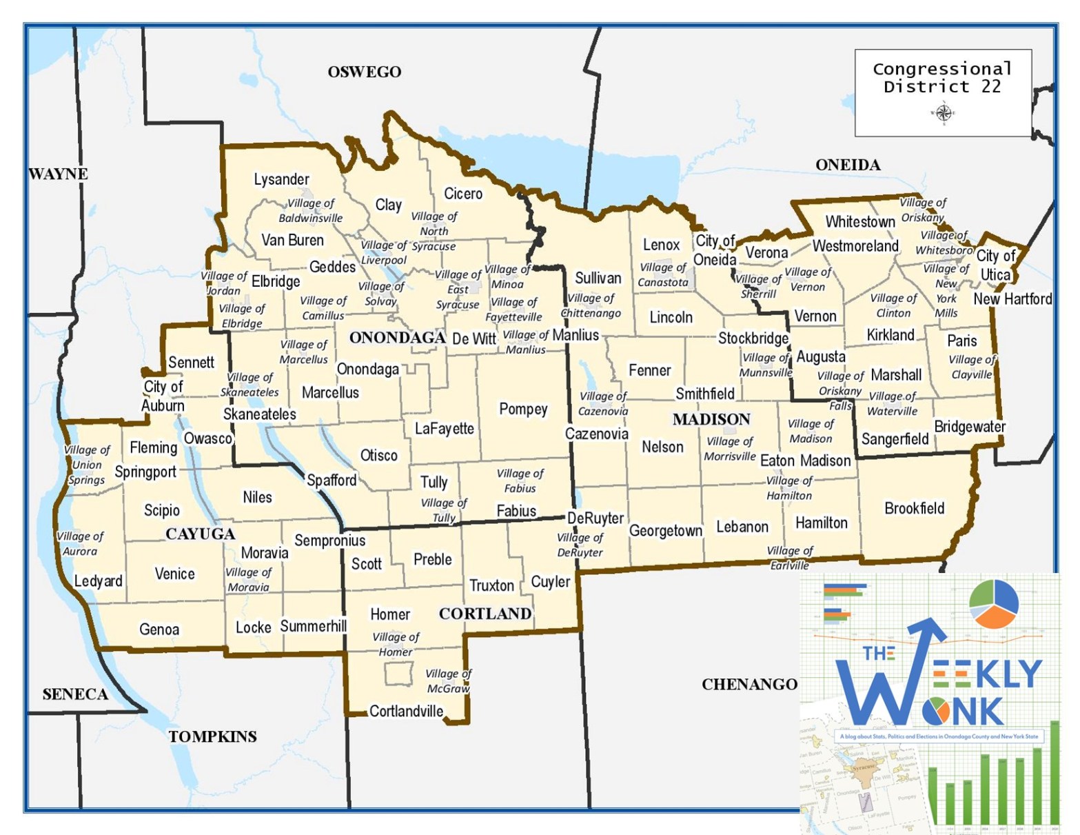 Welcome back to the #weeklywonk. In this space I try to shed light on the forces that make up the body politic in New York and Onondaga County. Each week I will look at electoral and registration data that make up a political subdivision or an election event. I continue my look at political subdivisionsContinue reading “The Weekly Wonk: New York’s 22nd Congressional District 2024”